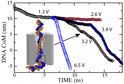 To establish the threshold field required to drive dsDNA through the pore, we restarted our simulation of the 2.0 nm diameter pore from the conformation shown here. In the figure below we plot the dsDNA center-of-mass against time for a 1.3 (movie), 2.6 (movie), 3.2 (movie), 3.9 (movie) and 6.5 V (movie) bias. These results indicate that dsDNA permeates a 2.0 nm diameter pore for voltages > 2.6 V.