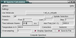 This plugin provides a graphical interface to compute spectral densities from trajectories using time series data created with the measure dipole command in VMD and a custom spectral densities plugin to compute the auto-correlated Fourier transform. Please note that this is using the total dipole moment of all atoms in the selection and not averaging over individual molecules. The latter and other types of auto-correlations can be computed through the script interface of the specden command which is part of the SignalProc plugin collection and described in the respective documentation. The spectral density plugin also supports a selection of thermal corrections to the peak intensities. It is recommended to stick to the default setting (harmonic) unless you know what you are doing. You have to have a trajectory already loaded and have the option to view the resulting spectrum in a MultiPlot window and write it to a file.