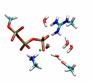 Our research focuses on investigating the ATP hydrolysis reaction and its interaction with the protein environment in the catalytic sites of F1-ATPase using computer simulations. To be able to study a chemical reaction inside the extended protein environment provided by the catalytic sites we employ combined quantum mechanical/molecular mechanical (QM/MM) simulations to investigate both the βTP and βDP catalytic sites. Fig. 3 depicts the quantum mechanically treated region of the former. Quite surprisingly, our simulations show that there is a dramatic change in the reaction energetics in going from βTP (strongly endothermic) to βDP (approximately equi-energetic), despite the fact that the overall protein conformation is quite similar. In both βTP and βDP, the actual chemical reaction proceeds via a multi-center proton relay mechanism involving two water molecules. A careful study of the electrostatic interactions between the protein environment and the catalytic core region as well as several computational mutation studies identified the "arginine finger" residue αR373 as the most significant element involved in this change in energetics.
