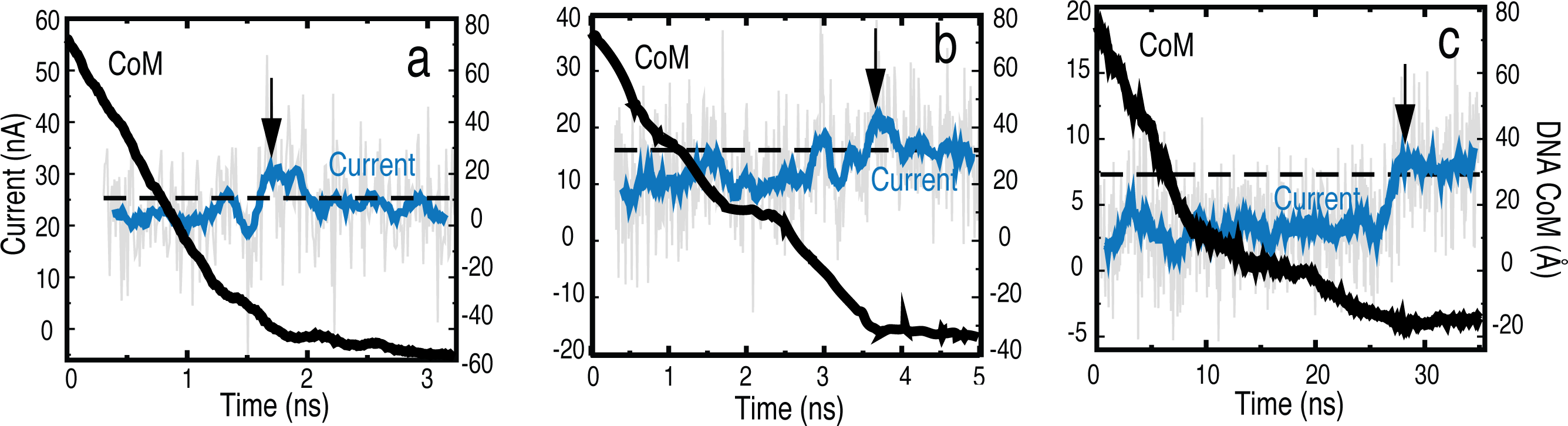 Fig. 3 - Electrophoresis of dsDNA through graphene nanopores for bias voltages of a) 4.3 V, b) 2.5 V and c) 0.8 V.